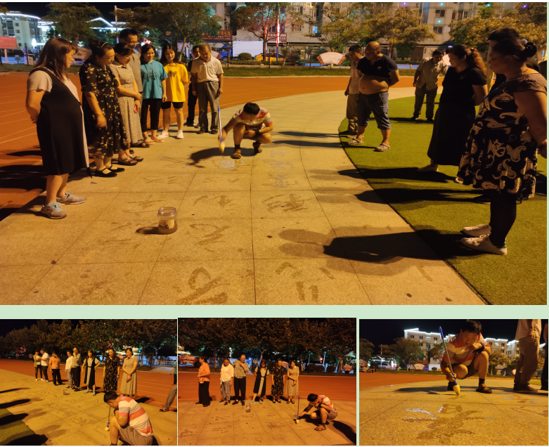 农场的职工居民看到他在写字时,一些有书法功底的人也不免上去拿来笔,也在地上尝试下写字,并和他交流,感受在广场地面上写字的乐趣。