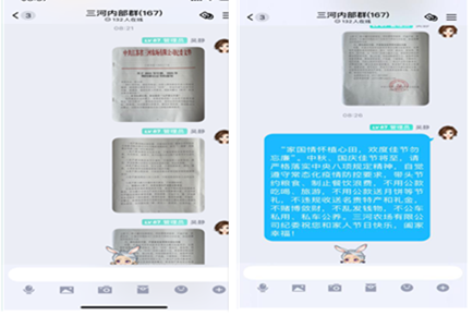 近年来,三河农场有限公司纪委坚持利用重大节假日时间节点向全场管理人员发送廉洁短信,已经成为廉洁教育常态。通过发送廉洁短信,既表达了节日祝福,又使大家提神醒脑、警钟长鸣,营造了风清气正的节日氛围。