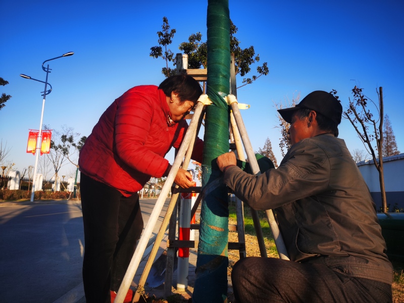 12月1日,温暖的阳光洒在人的身上驱走了冬季的严寒,宝应湖农场公司职工任连根夫妇俩正在检查前期的树木包衣,做好加固完善。