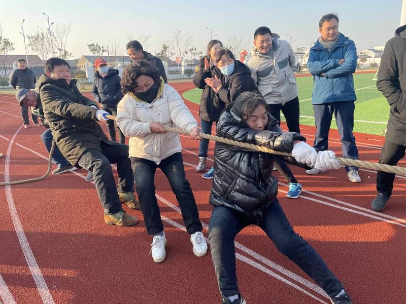 “加油,加油!”12月30日,宝应湖农场体育广场,由男女按比例组成的12支代表队正在紧张角逐“迎新年”拔河比赛。