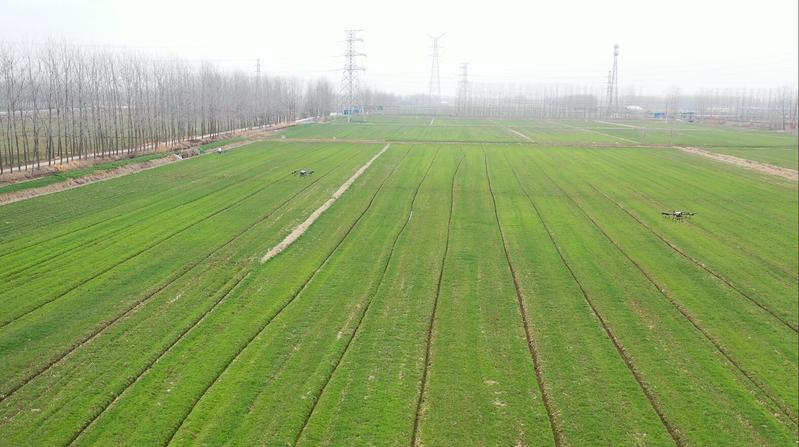 2月16日,在宝应湖分公司共和生产区四队的一块麦田里,三台大型植保无人机正在对4000亩白麦进行施肥。