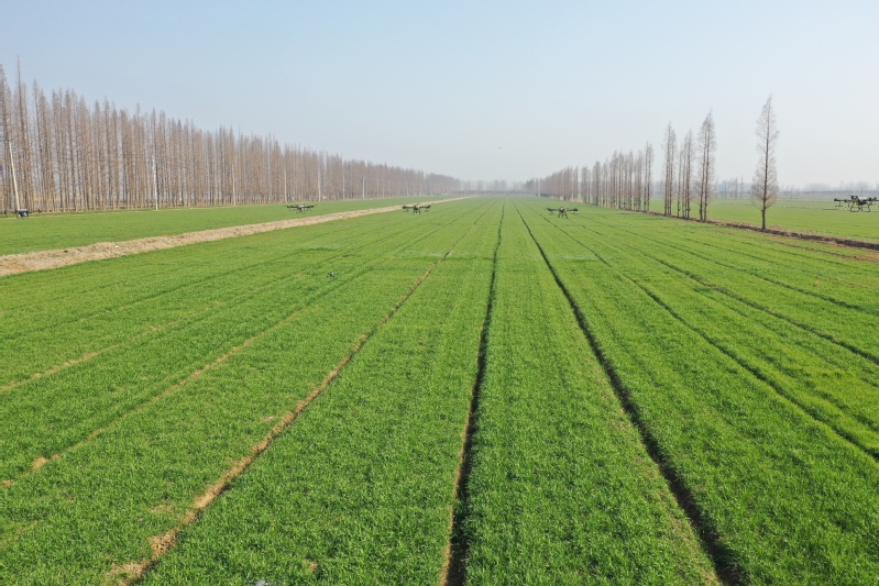 2月26日,宝应湖分公司一生产区小麦田里一派忙碌,植保机、飞防机正在田间进行针对性化除。