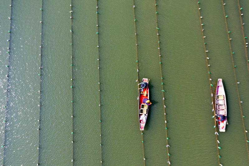 2月26日,宝应湖农场刘圩养殖场河面上,波光鳞鳞,工人们正在放养嫁接好的河蚌,播撒春天的希望。