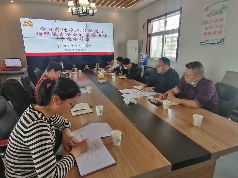 4月22日,三河农场第二党支部组织全体党员、积极分子围绕习近平总书记关于粮食安全的重要指示批示精神和江苏省关于粮食安全工作的方针政策和决策部署开展专题学习。