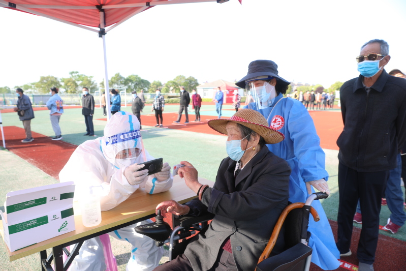 “请从这边走!”转业军人、青年党员孙强,标准军人站姿导引着检测居民有序进入,成为检测中的一道风景。青年党员赵珊、沈燕是一对好姐妹,由于连续的叫喊让沈燕的嗓子嘶哑,今天她俩特意交换的分工。“这队人少,请到这队来!”接过好姐妹手中的大喇叭,赵珊大声招呼着,将进入检测区的居民有序分流到3个采样区。“你们在这里等我会儿,我先帮你们登记。”换成维护秩序后,沈燕时刻关注着检测的人群。70多岁的王奶奶家住刘圩小区,独自一个坐着电动轮椅来到刘圩居委会核酸采样点。沈燕见状立刻上前引导她来到绿色通道,热情地帮助她登记信息。不到5分钟,王奶奶就完成了采样。沈燕又小心地把她带到了检测出口。细心的党员孙伟,在检测中发现有不少行动不便的老人。今天他提前借来了一辆轮椅,看到年老体迈的老人,他就主动迎上去,把老人推进检测绿色通道,从扫码测温到登记采样,再到出口离开,最后把老人安全地交到老人家人手中。