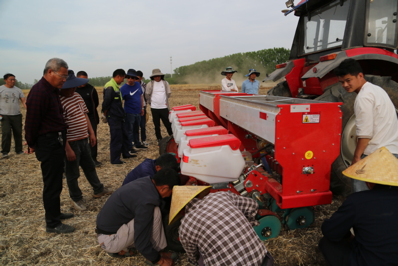 在现场,农机站工作人员不时检查旋耕质量、开沟深度,测量畦面宽度,认真做好玉米大豆播种前准备工作。在全部就绪后,播种机缓缓驶入地里,装载好玉米、大豆种子和化肥。来自播种机厂家人员在播前进行调试,根据播种实际情况向观摩人员介绍播种机的性能、特点和操作要点。