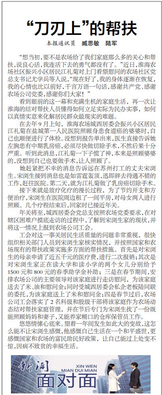 在7月14日出版的《盐城晚报》和7月15日出版的《射阳日报》上,先后以《社区关怀及时送到家 农场居民受惠心怀感激》和《“刀刃”上的帮扶》为题,报道了淮海农场公司职工臧思敏采写的新闻稿,将淮海农场有限公司工会和农场社区倾心为民办实事、解难事的过程见诸报端,从而也彰显了淮海农场公司党委践行“我为职工居民办实事”的理念,着手解决事关职工居民的“急难愁盼”的民生问题,从而也赢得了职工居民的称赞。