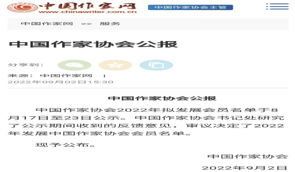 近日,根据中国作家协会公报,中国作家协会2022年拟发展会员名单于8月17日至23日公示。中国作家协会书记处研究了公示期间收到的反馈意见,审议决定了2022年发展中国作家协会会员名单,并于2022年9月2日进行公布。其中江苏60人,江心沙农场有限公司90后职工袁伟榜上有名。