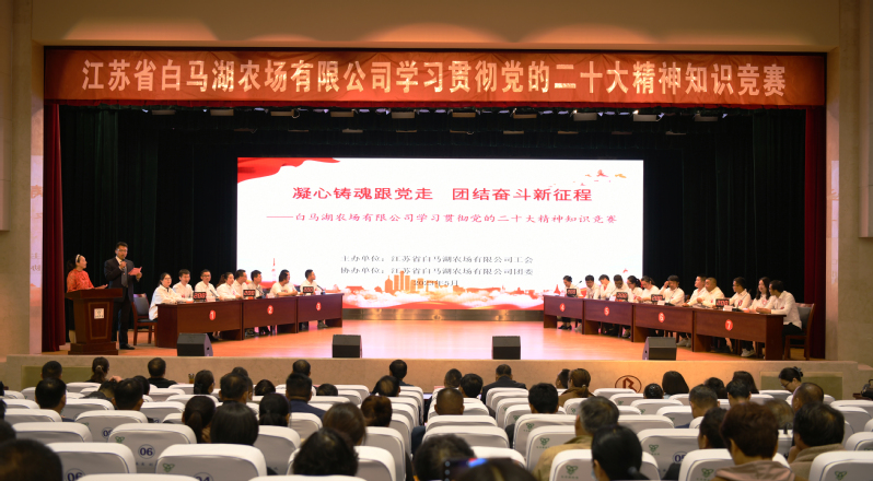 5月5日,白马湖农场公司“凝心铸魂跟党走 团结奋斗新征程”学习贯彻党的二十大精神知识竞赛在职工礼堂火热开赛。党委书记、董事长韩正光,党委副书记、总经理韩树明,副总经理衡爱军,纪委负责人时奎敬,第二片区财务总监奚兴林出席竞赛。来自机关和各单位的21支代表队共计63人参加竞赛。