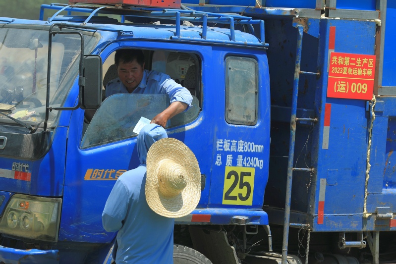 严把关口,保障质量。全场统筹协调,严把各个关口,做到“收割有人看、道路有人巡、场头有人管、质量有人检”,充分保障小麦质量。牢固树立“减损就是增产”的意识,严控作业速度,调整作业幅宽,提高作业质量和效率,全力控制小麦机收减损率;“请拿好您的运粮交接单”在共和生产区,工作人员正在给装满小麦的运粮车递交交接单。交接单明确标注了生产区大队条田号、收割机主、承运车号、驾驶员、场头接收人等详细信息,“一张单”实现了从田头到场头的粮食运输保障监管。小麦运至场头后,工作人员对水份、杂质进行测量,视水份情况安排晒粮、烘干、入库;各生产区成立作业质量检查组,分公司成立4个田间作业质量督查组,全程跟踪督查收割质量,将农机作业质量与作业费用、责任人相挂钩,严格执行优质优价、按质论价,全面提高农机作业质量。