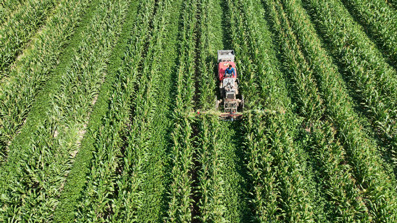 苏垦农发抓好12万亩玉米大豆带状复合种植精细化管理,在去年成功试验的基础上,组织农机对玉米进行去顶,既降低植株高度,减少倒伏风险,又增加了玉米大豆受光面积,促进产量提高。图为农机在苏垦农发东辛分公司玉米大豆田间进行玉米去顶作业。