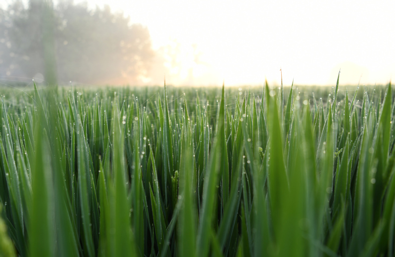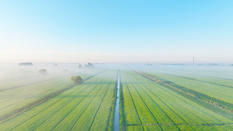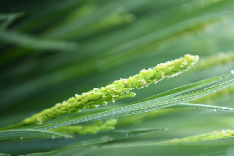 阳光下,雾气散,空气中弥漫着清新的稻花香。俯瞰葱绿的稻田,如一条条绿丝带整齐排列。晶莹的晨露凝结在青翠的秧苗上,犹如给稻田蒙上了一层剔透的面纱。刚抽出的稻穗上,有白色的稻花点点,随着稻穗一起随风轻舞飞扬。小蜘蛛也赶来凑个热闹,在枝叶上织起了“秋的毛衣”。