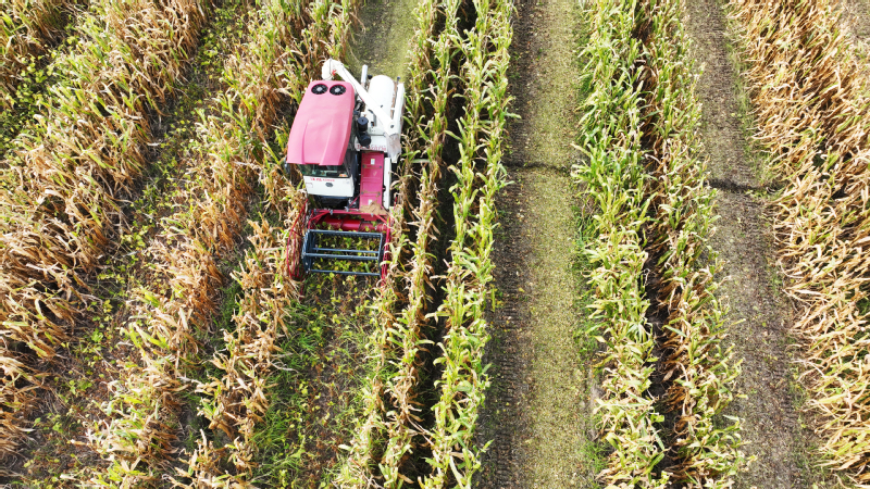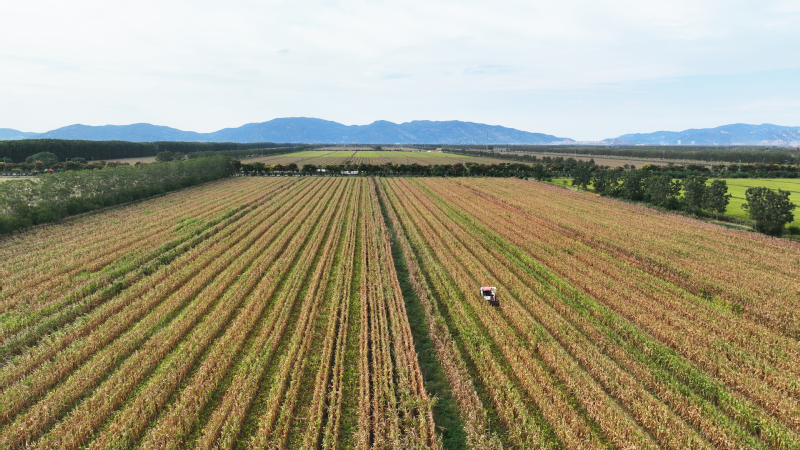 今年江苏农垦大豆玉米带状复合种植面积达12万亩,目前大豆玉米已经陆续成熟。图为苏垦农发东辛分公司农机在田间收割大豆。