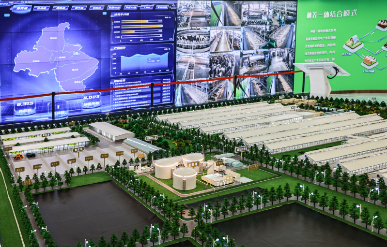 生态化发展加速转型。牧场智慧生态系统中,污水循环管理设备包含牧场污水管路3D图与污水监测点位信息,做到实时监测牧场污水指标,并将数据同步上传至环保局,确保牧场水质监管到位。沼气发电系统将标准化工艺处理粪污产生的沼气,用于发电后接入国家电网,沼液利用后的沼渣作为奶牛牛床垫料的生产原料,不仅成本低,更大大降低了养殖风险。同时在场区配备废气检测设备监测养殖气体环境,配备消防监控设备监测饲草区与沼气发电区域烟火状况。智能生态系统采取粪污固体发酵、沼气烘干回床、沼液还田方式,实现“变废为宝”。对牧场粪污发酵后的液位进行采集,经过无害化处理后的沼液通过预设专用管道,在卷盘式喷灌机的运转下自动喷洒在专属消纳用地的田间作物上,形成种养一体循环,有效提高了粪污综合利用水平。