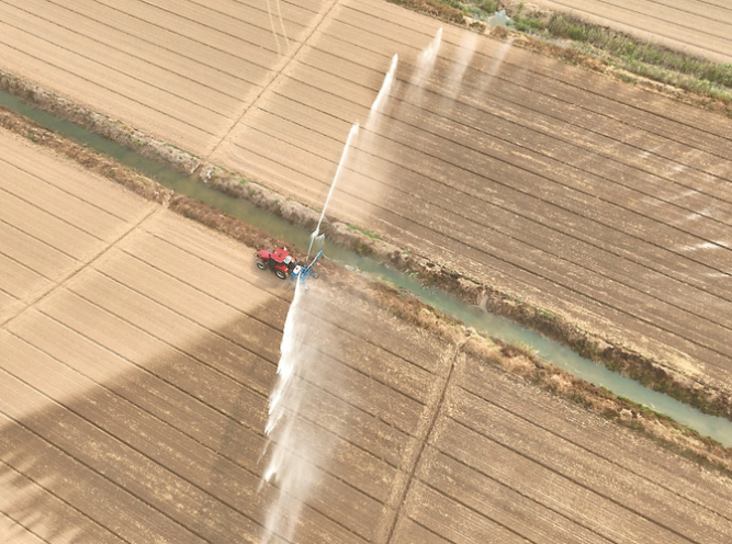 近日,在射阳县淮海农场四分场刚播种的玉米大豆带状复合种植农田内,喷灌机正在田间进行抗旱作业。 陆军 摄 (视觉江苏供图)