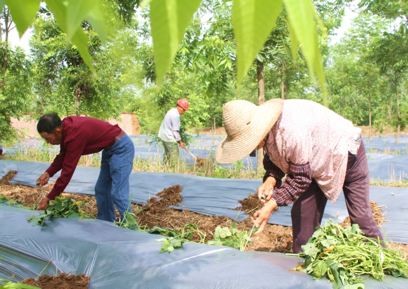 铺膜、栽苗、覆土……6月24日上午,宝应湖农场公司金唐路北侧老船修厂薄壳山核桃林下,林木公司管理员们正忙着指导工人栽种烟薯苗。只见12名工人分头行动、密切配合,他们或两人同时栽植,或栽苗、覆土流水线作业,还有的前面两人覆膜、后面两人覆土,现场一派繁忙景象,一幅幅生机勃勃的林下农耕图跃然眼前。