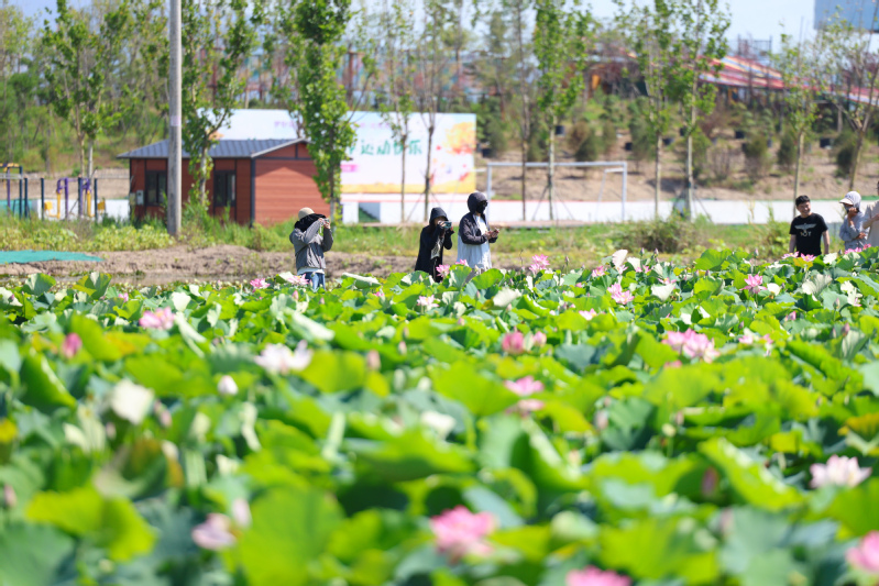 荷开满塘,浮香绕岸,绽放出云水湾湿地公园最好的风景。走进云台农场云水湾湿地公园水生花卉基地,满塘的荷花竞相绽放,微风轻拂,荷花荷叶随风起舞,空气中弥漫着淡淡的荷香,荷塘边游人纷纷拍照打卡。孩童们结伴拿着网兜在睡莲池边捕捉着小龙虾,为夏日的云水湾增添一抹野趣。