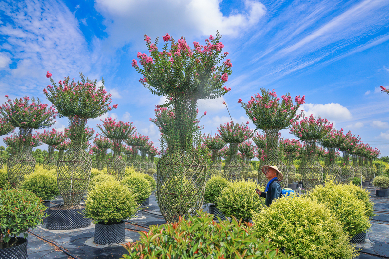 8月14日,在江苏省盐城市射阳县,江苏农垦新洋农场容器苗项目基地,管理人员正在养护紫薇花瓶。近年来,新洋农场利用容器苗基地优势,在栽培方式上大胆尝试,通过扦插培育,实现了自繁自育栽培技术的新突破,容器栽培的模式使苗圃成活率更高、绿化效果更好,优良的品质广受全国各地绿化项目方的青睐。