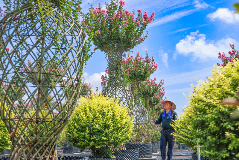 8月14日,在江苏省盐城市射阳县,江苏农垦新洋农场容器苗项目基地,管理人员正在养护紫薇花瓶。近年来,新洋农场利用容器苗基地优势,在栽培方式上大胆尝试,通过扦插培育,实现了自繁自育栽培技术的新突破,容器栽培的模式使苗圃成活率更高、绿化效果更好,优良的品质广受全国各地绿化项目方的青睐。