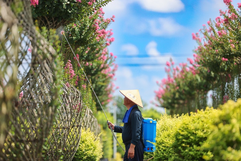 8月14日,江苏省盐城市射阳县,在江苏农垦新洋农场容器苗项目基地,管理人员正在为紫薇花瓶喷施药物防病治虫。据悉,新洋农场建成配有水肥一体、智能控制等设备的容器苗圃200亩。张伟生摄(中经视觉)