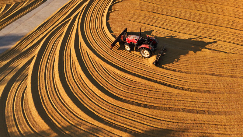 江苏省连云港市海州区云台农场工作人员抢抓晴好天气翻晒稻谷(10月28日摄,无人机照片)。“新筑场泥镜面平,家家打稻趁霜晴。”金秋时节,各地迎来丰收季,农民抓住晴好天气收割收获晾晒谷类作物,田间地头呈现一派忙碌的丰收景象。新华社发 耿玉和 摄