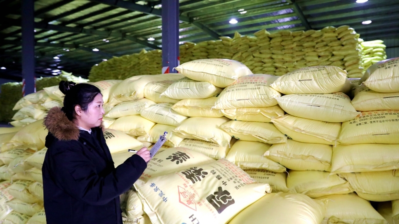 2月6日,苏垦农服东辛分公司仓储中心内,仓库保管员正在清点春耕农资,为春耕做好储备。