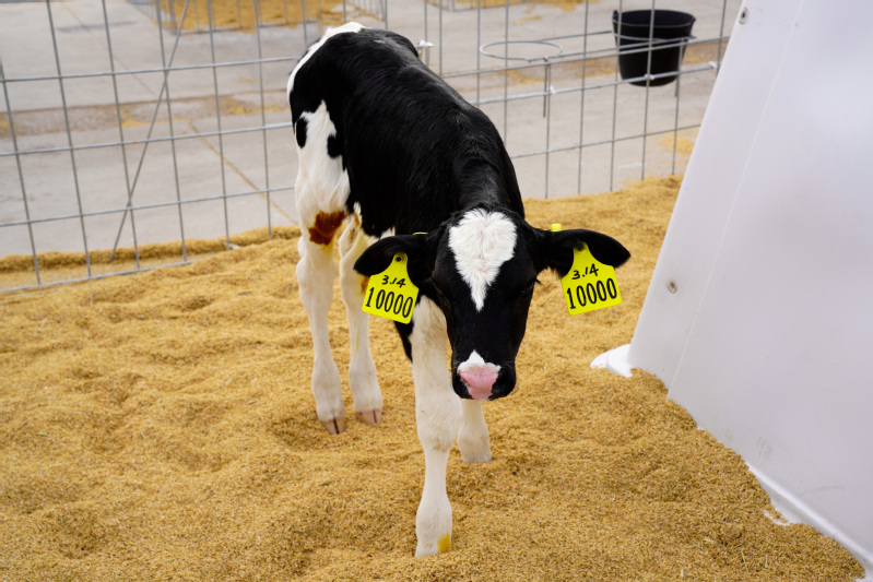 “晨曦”出生时,体重46公斤,头顶带有独特的水滴图案,全身覆盖着柔软的绒毛,一双乌黑发亮的眼睛里充满了对世界的好奇。为迎接这位特殊成员的到来,犊牛饲养员们早在三天前便着手筹备,精心选定采光最佳、通风最优的位置,并对地面反复冲洗,铺上一层厚厚的稻壳,给这头万里挑一的牛宝宝提供一个温暖舒适的“专属小窝”。为了纪念这一具有历史意义的时刻,技术人员专门为“晨曦”佩戴了刻有“10000”字样的专属电子耳标。