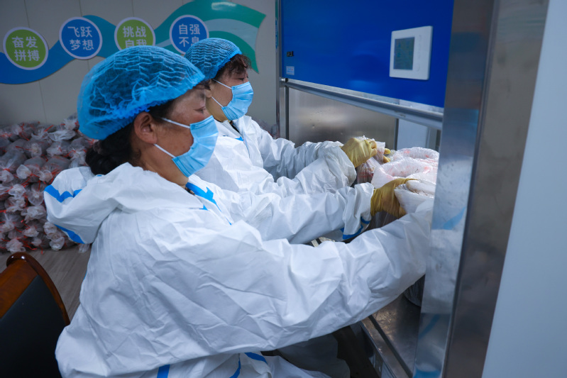 近日,在云台农场兴垦科技工作室内,工作人员正在进行灵芝接种工作。整个接种过程在严格的无菌环境下进行,工作人员将灵芝菌种小心地放入椴木孔洞中,为灵芝生长创造良好的条件。据悉,本次接种工作将处理15000个菌棒,菌丝发满后将进行定植工作。