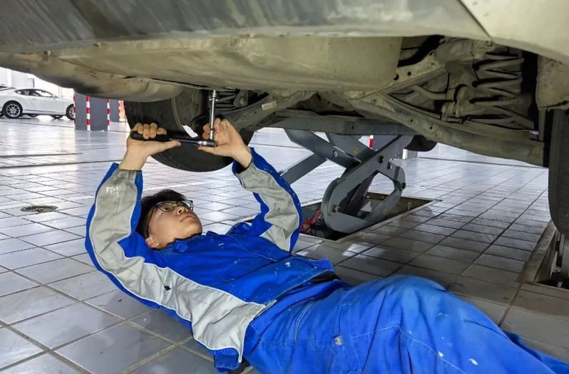 苏舜元吉公司(上汽大众4S店)钣金技师胡同浩斜躺在地上,正在拆卸一辆凌渡车损坏的零件,汗水顺着他的额头流下,他的眼神专注而坚定,双手始终没有停歇,确保该车辆维修项目快速、有序进行。