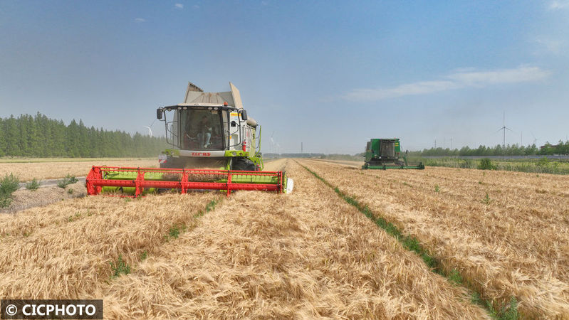 2025年5月20日,联合收割机在位于江苏省盐城市射阳县的江苏农垦新洋农场大麦田里作业。CICPHOTO/张伟生 摄