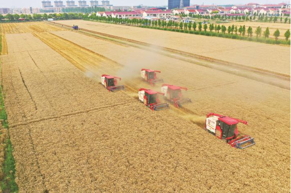 24日,随着5台收割机在田间来回穿梭,江心沙农场本部小麦正式开镰收割,吹响“本部+外拓+全托管”3万余亩夏粮收割会战集结号。全力以赴赶进度,在确保颗粒归仓的同时,为水稻移栽、夏玉米播种等腾出空间、抢出时间,实现高效腾茬和收、种、管无缝衔接。