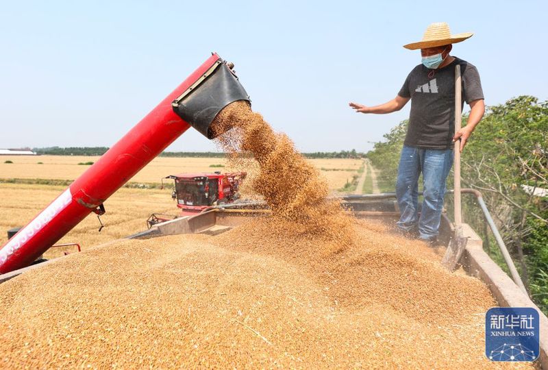 5月28日,江苏农垦三河农场职工在装车收割的小麦。新华社发(许昌银摄)
