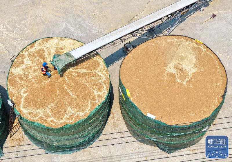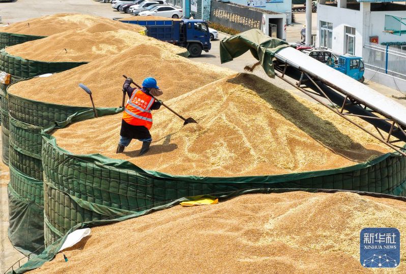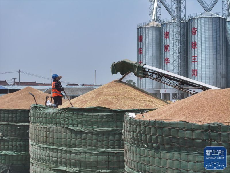 三河农场收获的小麦进入大华种业三河分公司存储(5月28日摄,无人机照片)。新华社发(许昌银摄)