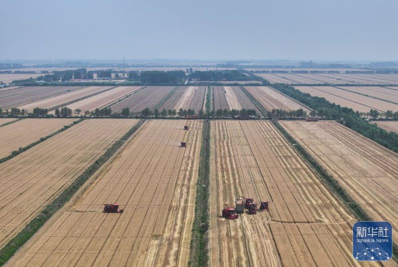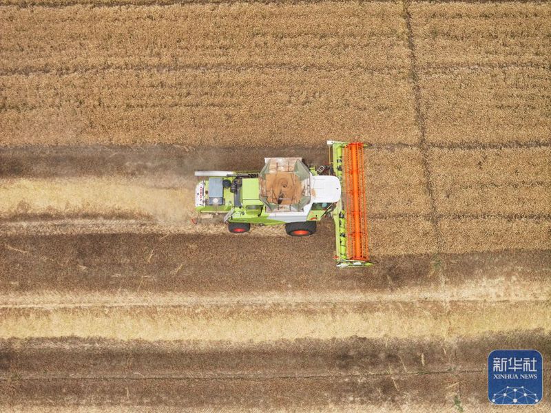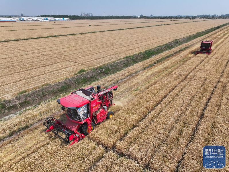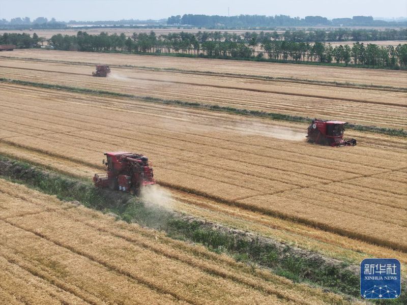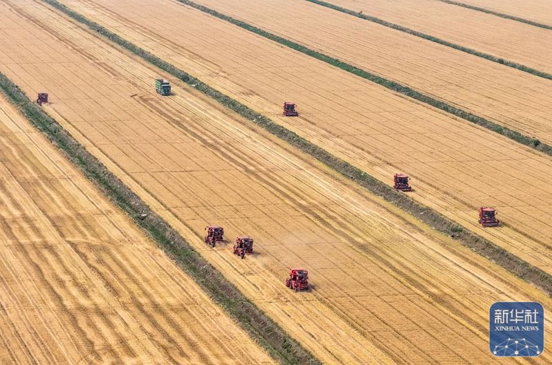 5月28日,收割机在三河农场收割小麦(无人机照片)。新华社记者 季春鹏 摄