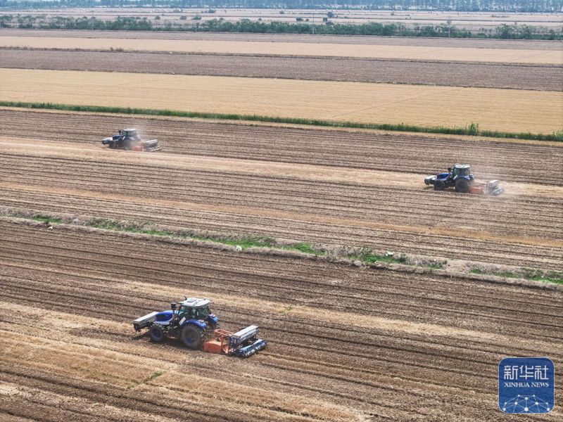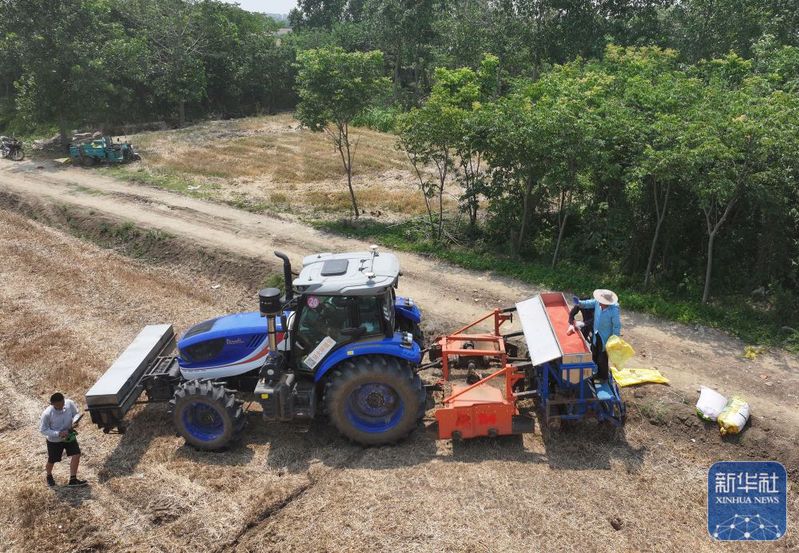 5月28日,三河农场职工向扬州大学研制的“九合一”稻麦耕播机内装稻种(无人机照片)。新华社记者 季春鹏 摄