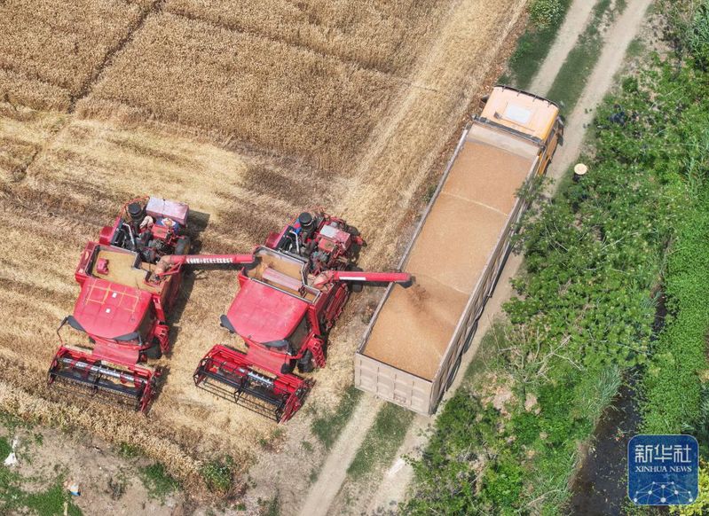 5月28日,在三河农场,收割机将小麦装车(无人机照片)。新华社记者 季春鹏 摄