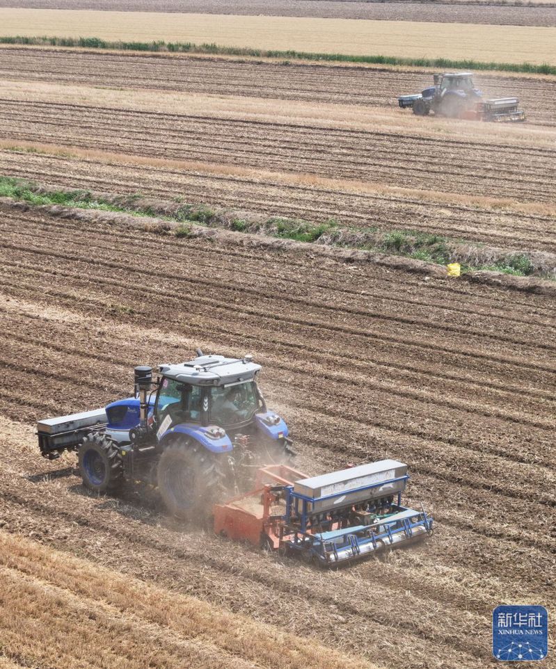 5月28日,扬州大学研制的“九合一”稻麦耕播机在三河农场播稻种(无人机照片)。新华社记者 季春鹏 摄