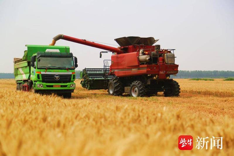 “这片小麦是去年10月初播种的,品种为华麦17。” 岗埠农场高桥生产区高南队管理员姜茂合介绍道。说话间,穗粒饱满的小麦被卷入收割机仓,切割、脱粒等工序一气呵成,一颗颗金黄饱满的麦粒从卸粮口倾泻而下,迅速将运粮车车厢装满。岗埠农场6.4万余亩小麦成熟度良好,农场紧扣“早”“抢”二字,提前调配收割机、拖拉机等各类机械300余台套,科学规划机型与收割时间,全力推进抢收工作。此外,农场自有烘干线日烘干能力达1880吨,仓容27000吨,并通过外租烘干仓储设施,多管齐下确保粮食烘储安全。