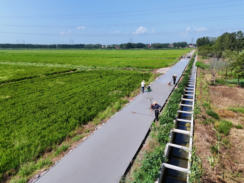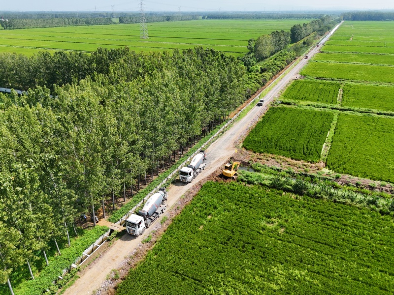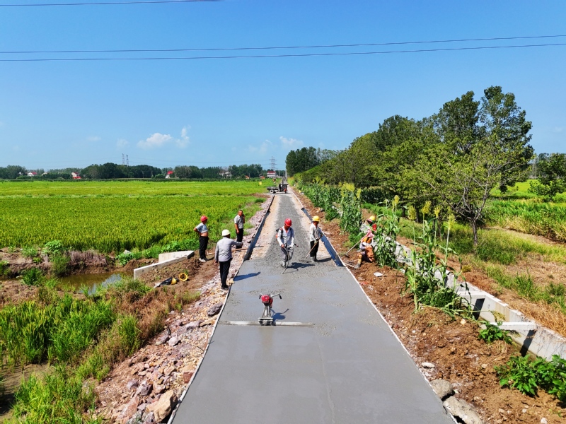 9月9日,江苏省连云港市海州区的江苏农垦岗埠农场高标准农田建设现场,施工单位抢抓晴好天气,加紧推进高标准农田配套水泥路建设,切实推动农田道路提档升级,促进农业发展。作者:徐卫 摄