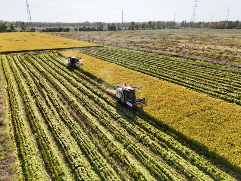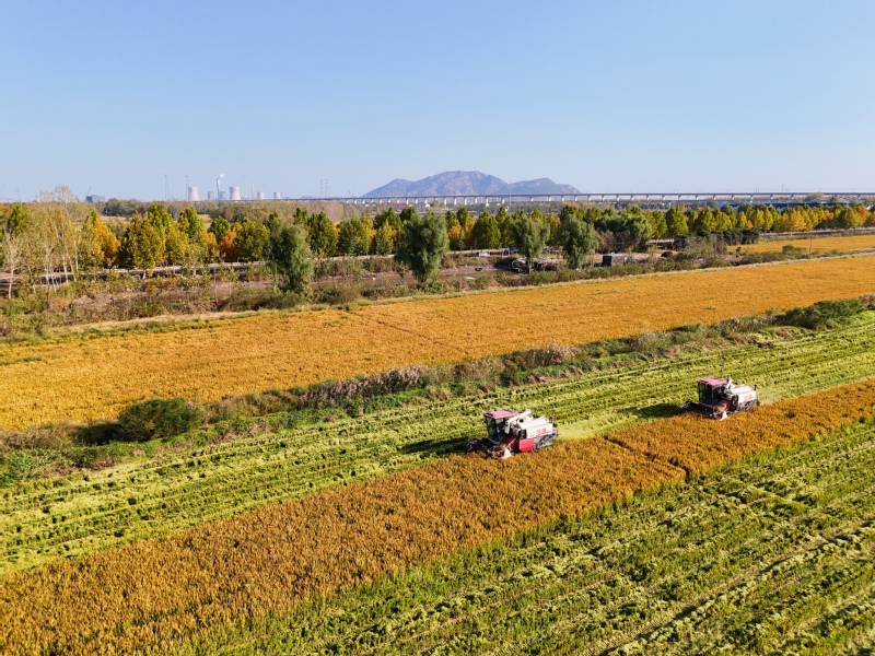 11月2日,在江苏省连云港市海州区江苏农垦岗埠农场的高标准农田里,职工们利用晴好天气,积极开展水稻抢收工作,确保不误农时、颗粒归仓。