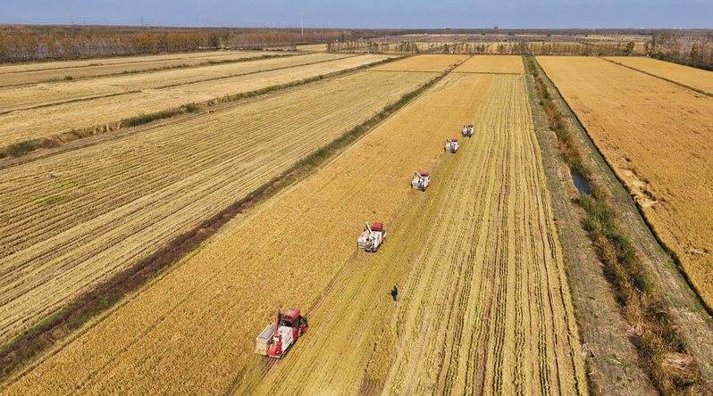 11月5日,连云港市海州区,江苏农垦岗埠农场的高标准农田里,职工驾驶收割机来回穿梭,开展水稻抢收工作。连日来,当地积极组织人员、机械,抢抓农时做好水稻收割工作,争取尽快完成秋收,确保颗粒归仓。徐卫 方冉冉 摄
