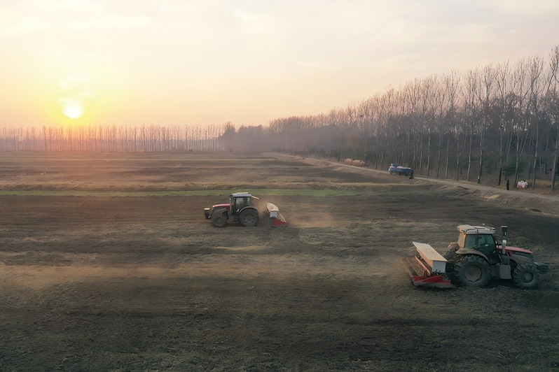 近日,连云港市海州区,播种机正在江苏农垦岗埠农场高标准农田里播种小麦。当地职工正在抢抓农时,进行小麦播种工作,为明年粮食丰收打好基础。