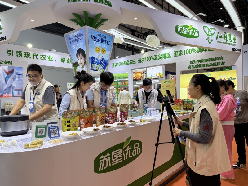 2025年12月4日,第二十八届中国(海南)国际热带农产品冬季交易会在海口国际会展中心盛大启幕。江苏农垦食品供应链管理有限公司携“苏垦优品”系列产品亮相展会。展区内陈列着“苏垦优品”“苏垦好物”等系列产品,吸引参观者纷纷驻足品尝,现场互动氛围热烈非凡。图为工作人员进行现场直播。