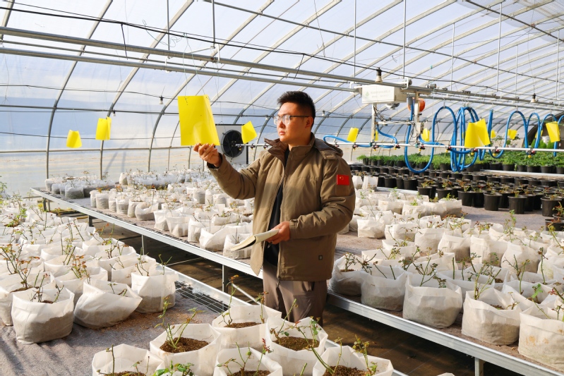 12月9日,江苏农垦岗埠农场的科技育苗大棚,工作人员对今年新引进栽植的盆栽月季、玫瑰花苗精准修剪花苗的枯枝、弱枝,查看病虫害发生情况,助力盆栽花苗平稳过冬。