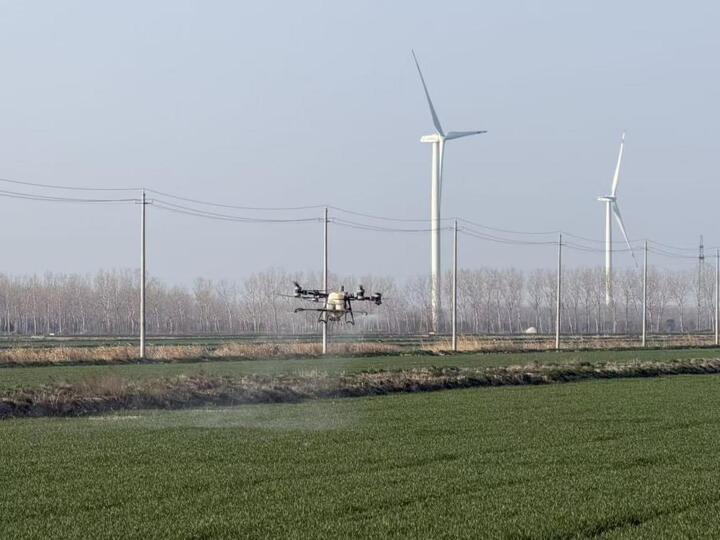 春风拂沃野,春耕启新程。3月14日,记者走进位于响水县的黄海农场,放眼望去,一望无际的麦田绿意葱茏,生机盎然。田畴之上,一架架满载水肥的植保无人机正按照预设航线穿梭作业,划破长空,为返青的麦苗送去春日的第一口“营养餐”。
