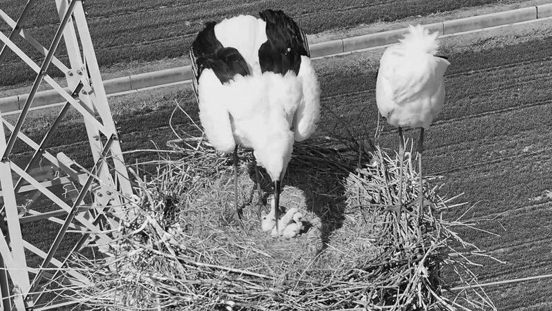 东方白鹳孵化出三只宝宝 陈冬平、王忠民供图