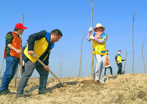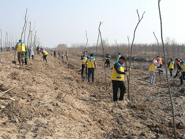 活动中,大家一派热火朝天的忙碌景象。搬运树苗,挥锹铲土,扶苗填坑,踏土夯苗,三五人一组默契配合,你运苗,我扶苗,他填土,认真地完成着每一道工序,栽下一株株树苗。活动持续一个小时,成功栽植3600余棵墨西哥落羽杉,取得了良好的成效。放眼望去,连片的树苗错落有致,在春风的吹拂下焕发出盎然生机。此次活动的圆满完成,为改善生态环境、助推绿色发展挥锄添绿,吹响了全场大绿化攻坚战号角。