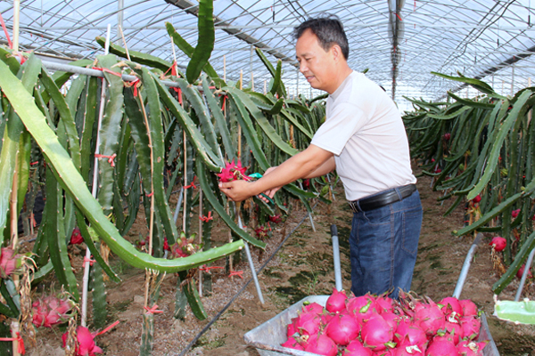 近日,坐落在�港农场有机农庄的红心火龙果种植基地迎来丰产。走进火龙果大棚,映入眼帘的是一排排仙人掌似的长茎,茎上挂着一颗颗火红的果子。江苏农垦首届创业劳模火龙果种植户李书华在50多度的大棚里指挥着工人进行采摘、选果,他一边擦着满脸汗水,一边告诉笔者:这些从台湾引进的红心火龙果从2016年开始在有机农庄安家,今年是第二年结果,目前有“蜜宝”和“香蜜龙”两个品种,由于今年天气炎热,果子的甜度也有所增加,火龙果上市时间也比去年提前了许多。