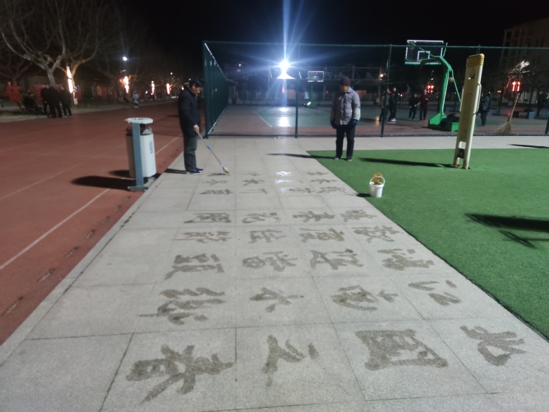 我们注意到,田海燕最喜欢书写毛泽东的诗词,让伟人的诗词再一次跃然纸上,让大家见证下伟人诗歌的风采魅力。田海燕有时用楷书书写苏轼的《水调歌头》,展示出了不俗的书法风格;有时他在书写时嘴里一边吟诵着,一边用楷书书写,让书法在研读中更有韵味。夜幕下写地书的镜头,也成为淮海职工休闲体育运动广场中的一道亮丽风景,增添了文化的艺术感染力。