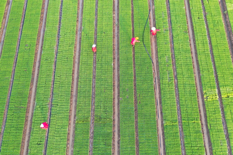 秧好半熟稻,苗好产量高。5月21日,小满,宝应湖农场三生产区职工正在进行小秧管理。